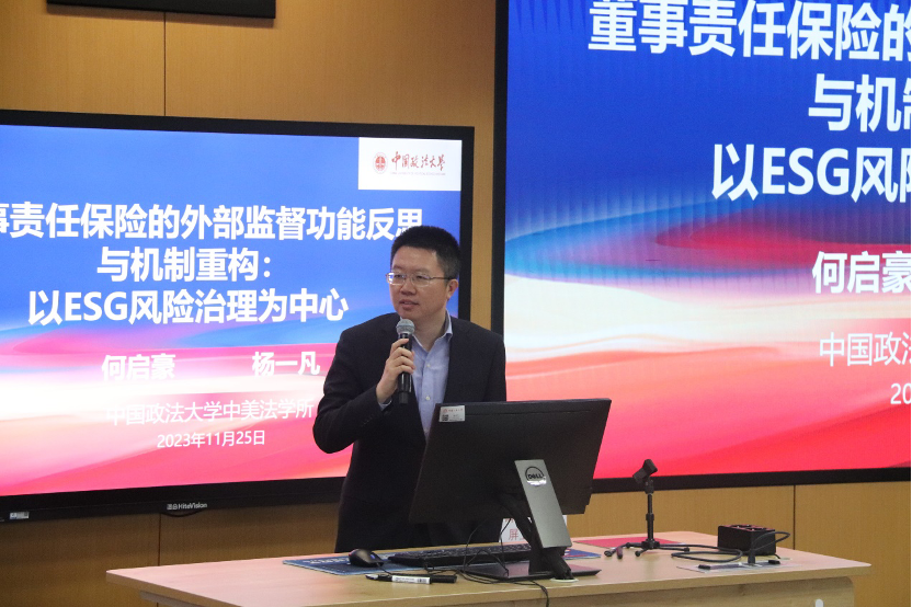 中国政法大学副教授何启豪以《董事责任保险的外部监督功能反思》为题发言