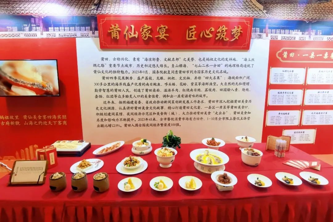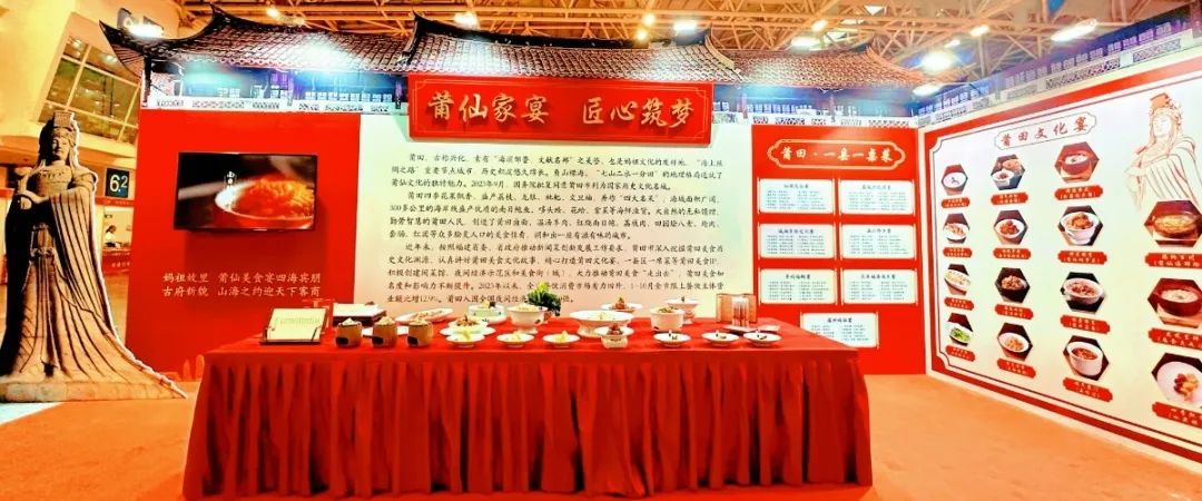 为宣传莆田美食创新发展工作成果,我市在新闽菜展示专区设置了以“莆仙家宴 匠心筑梦”为主题的莆田文化宴展区,以展板介绍、菜品展示、美食宣传片播放等形式集中展示莆田文化宴和“一县一桌菜”。