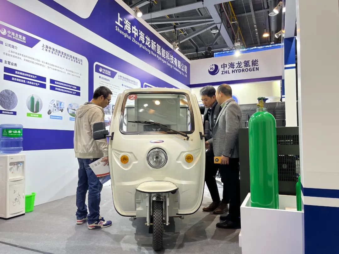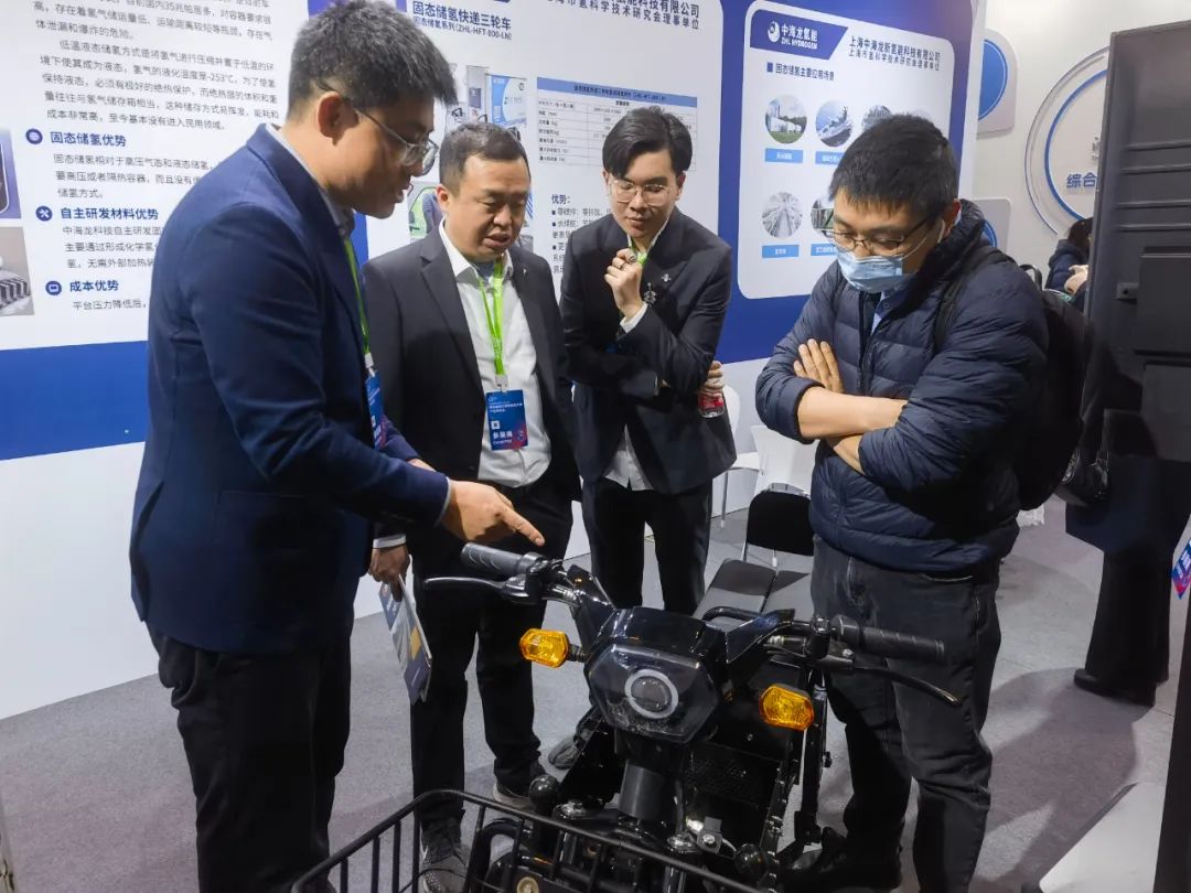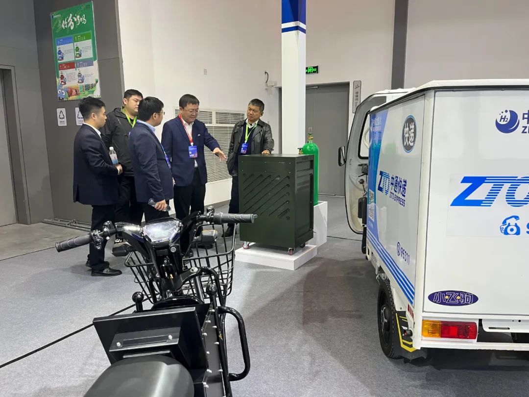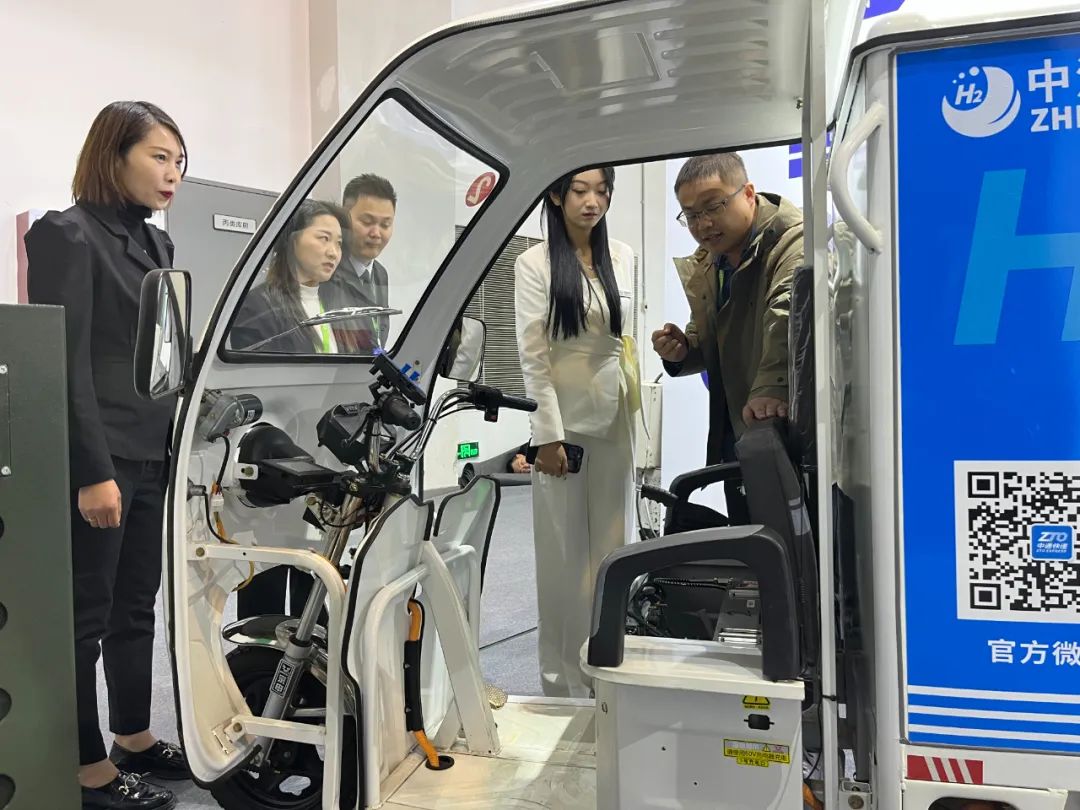 各位领导向参展客户介绍固态氢能快递二轮车、固态氢能快递三轮车内部构造与技术优势