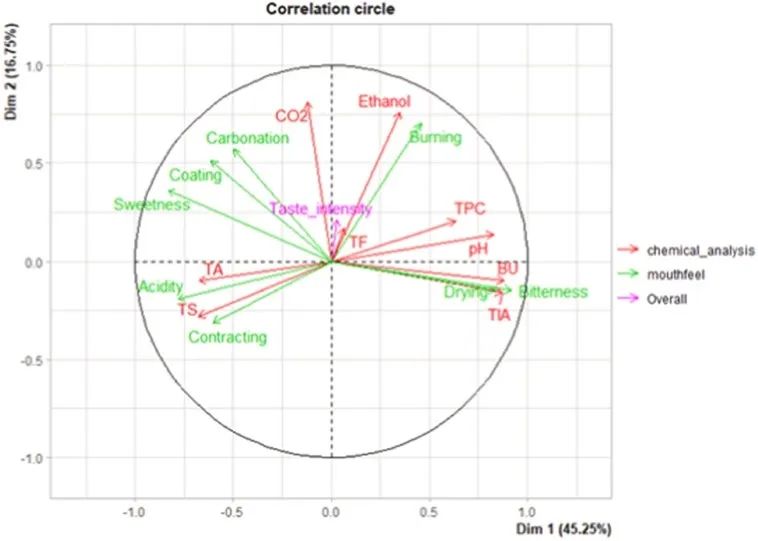 啤酒是世界上消费最多的酒精饮料之一,啤酒的分类有助于消费者找到最偏爱的啤酒。该研究利用19名专业感官员对24个啤酒样品的9种感官特性(干燥感、粘附感、收缩感、甜味、酸味、苦味、碳酸化、灼烧感、味度)进行了评价,同时对啤酒化学成分(总酸度、总类黄酮、总多酚、总糖、颜色、pH值、二氧化碳含量、乙醇、苦度、总异α酸)进行评价。通过方差分析、主成分分析、凝聚分层聚类分析和多元素分析技术探讨了化学成分和感官数据之间的关系,以便为口感量化提供新见解。