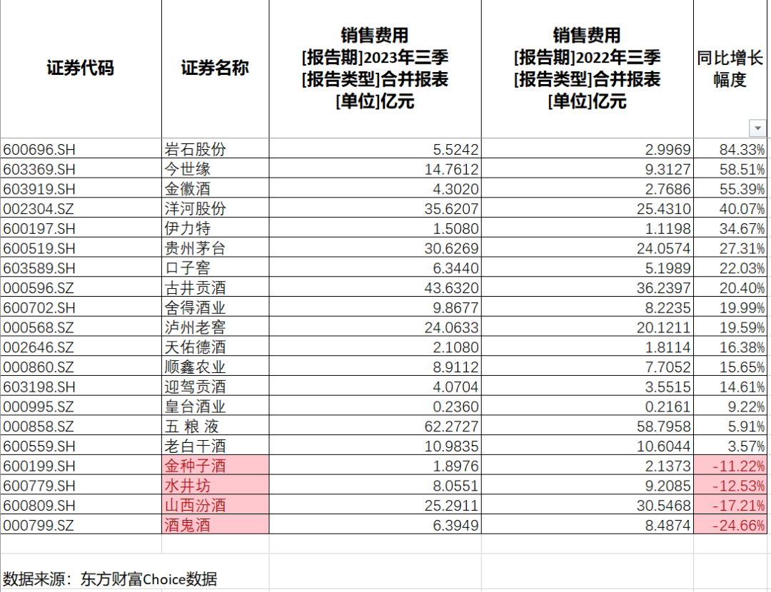 其中,岩石股份销售费用同比增长高达84.33%,位列行业第一;今世缘、金徽酒的销售费用同比增长幅度也都高于50%。