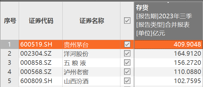 从最新的三季报存货规模看,截至2023年9月底,上述20家白酒企业存货总额为1363.54亿元,其中,贵州茅台、洋河股份、五粮液、泸州老窖、山西汾酒等5家酒企存货均超百亿元。特别是贵州茅台的存货高达409.90亿元,几乎等同于第2-4名的存货总和。