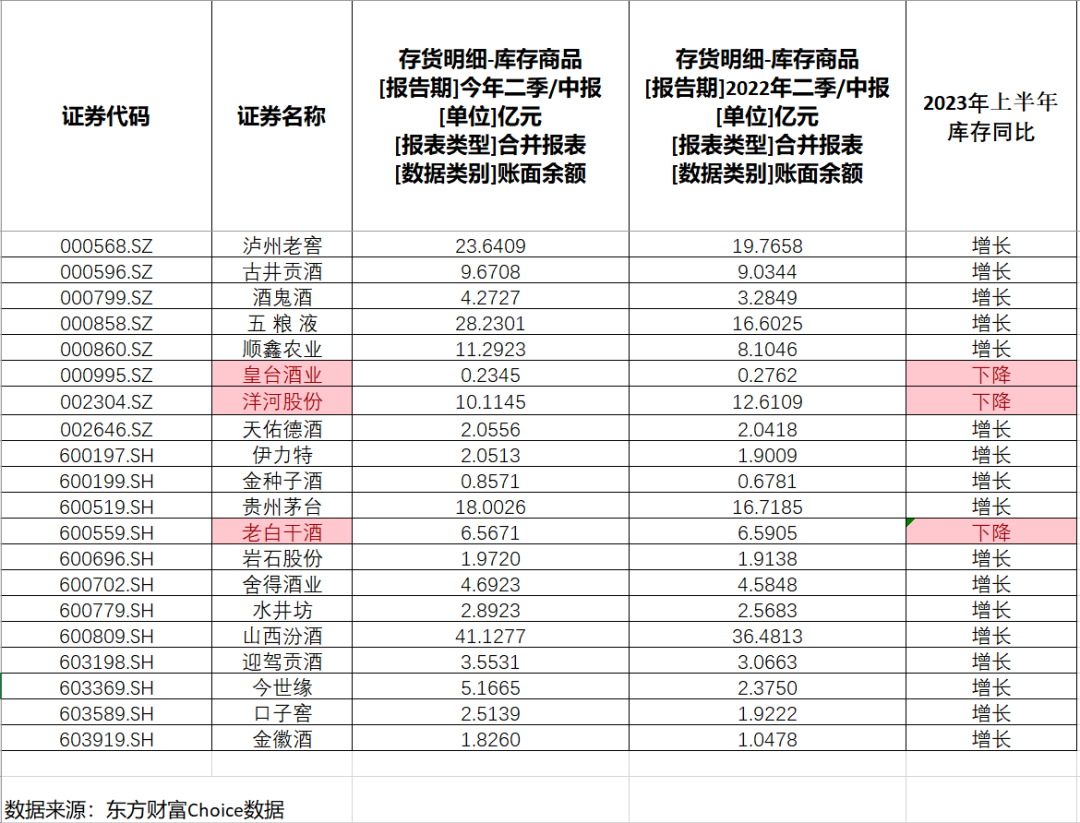 从财报数据来看,白酒企业今年的库存居高不下。览富财经网对比今年中报与去年同期的库存商品数据发现,按申万行业分类,在A股上市的20家白酒企业中,高达17家企业今年上半年库存同比都为增长,只有3家是下降状态,分别是皇台酒业、洋河股份、老白干酒。