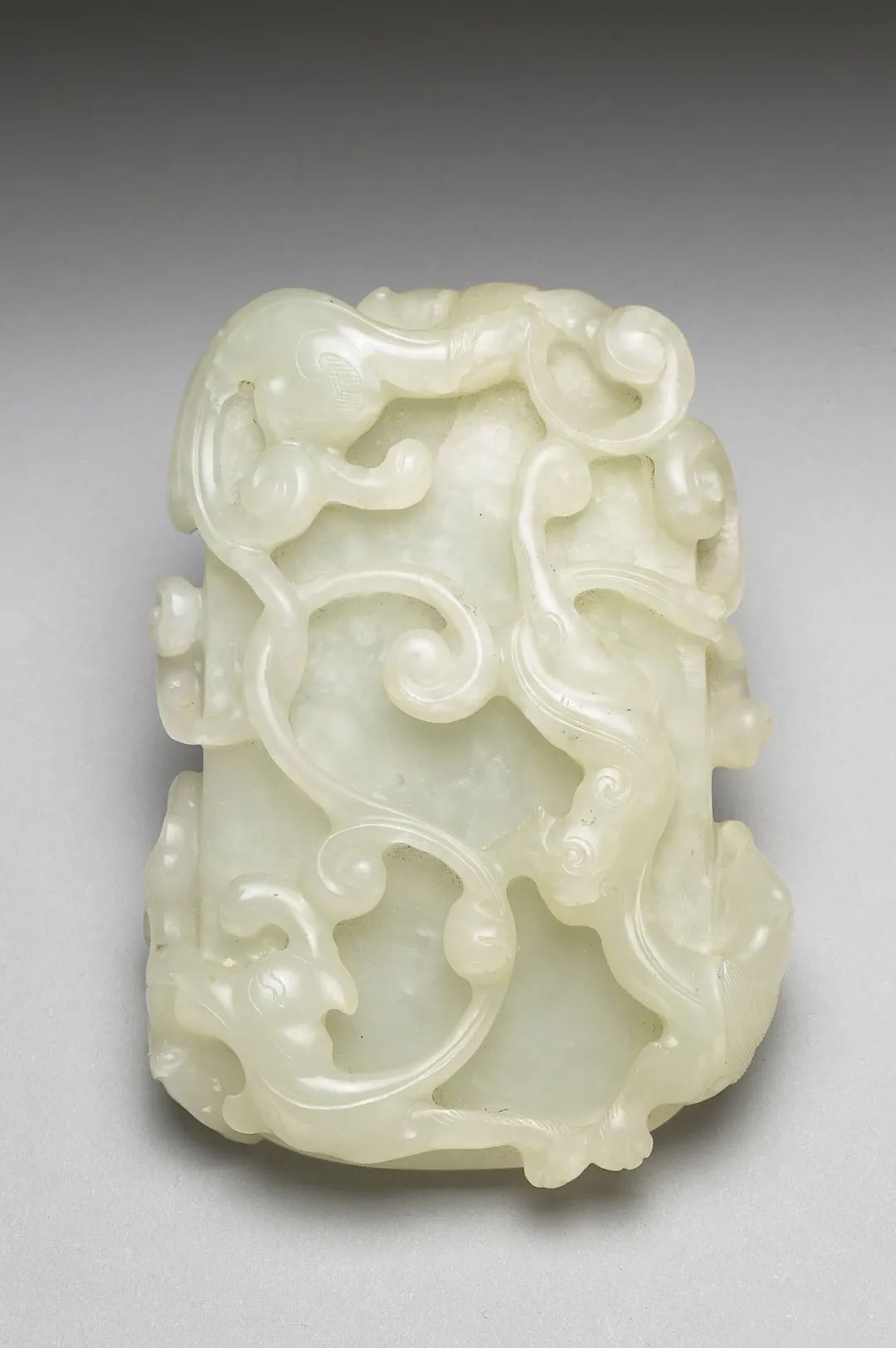 青白玉质,略带白绺。明晚期至清早期玉梅枝纹砚,略呈长方形。雕三隻螭虎,螭绕砚背,螭的头、爪均攀爬于砚缘,砚面阴线琢梅枝。