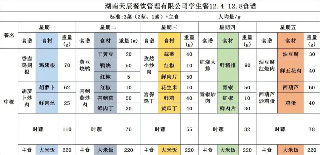 为进一步落实上级文件精神,加强学校配餐管理,确保学生学生营养均衡,提高学生就餐质量,现将长塘里阳光小学选用的湖南天辰餐饮有限公司一周菜谱带量进行公示,欢迎广大师生、家长提出宝贵意见。