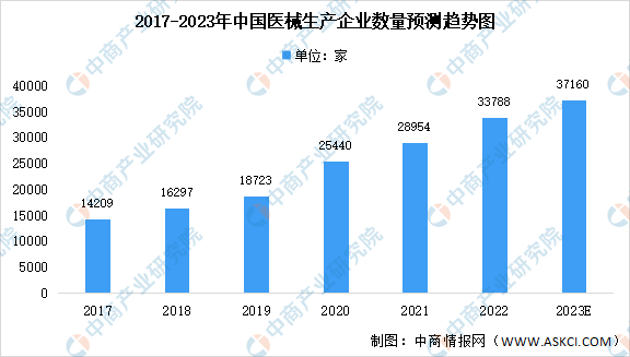 据医械数据云统计,截至2022年12月31日,全国医疗器械生产企业数量达33788家,较2021年的28954家同比增长16.7%。其中,可生产Ⅰ类产品企业23538家,可生产Ⅱ类产品企业15840家,可生产Ⅲ类产品企业2312家。预计2023年全国医疗器械生产企业数量将达37160家。