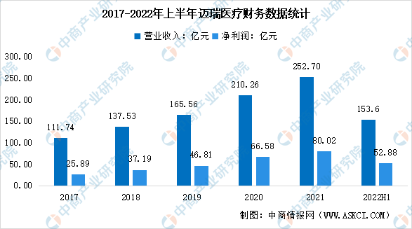迈瑞医疗为全球市场提供医疗器械产品,主营业务覆盖生命信息与支持、体外诊断、医学影像三大领域,通过前沿技术创新,提供更完善的产品解决方案,帮助世界改善医疗条件、提高诊疗效率。2022年上半年,迈瑞医疗实现营业收入153.6亿元,同比增长20.17%;净利润达52.88亿元,同比增长21.71%。