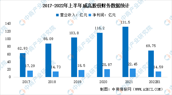 山东威高集团医用高分子制品股份有限公司及其附属公司主要从事研发及开发、生产及销售一次性医疗器械。威高股份生产的多种产品,主要可分为以下系列:一次性使用医疗耗材及原料、骨科材料及工具及血液净化系列耗材及设备。2022年上半年,威高股份实现营业收入69.75亿元,同比增长11.97%;净利润达14.59亿元,同比增长20.65%。