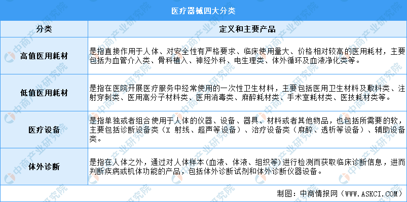 医疗器械是指直接或者间接用于人体的仪器、设备、器具、体外诊断试剂及校准物、材料以及其他类似或者相关的物品。按照医疗器械的具体用途,可将医疗器械分为高值医用耗材、低值医用耗材、医疗设备、IVD(体外诊断)四大类。