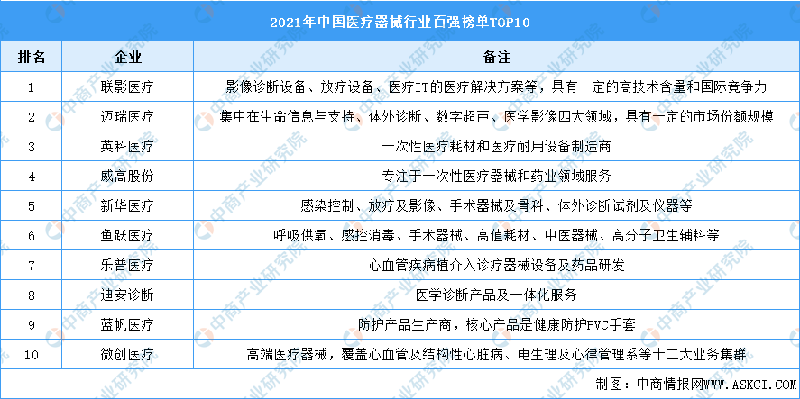 互联网周刊发布的“2021中国医疗器械行业100强榜单”显示,前十名分别为联影医疗、迈瑞医疗、英科医疗、威高股份、新华医疗、鱼跃医疗、乐普医疗、迪安诊断、蓝帆医疗、微创医疗。