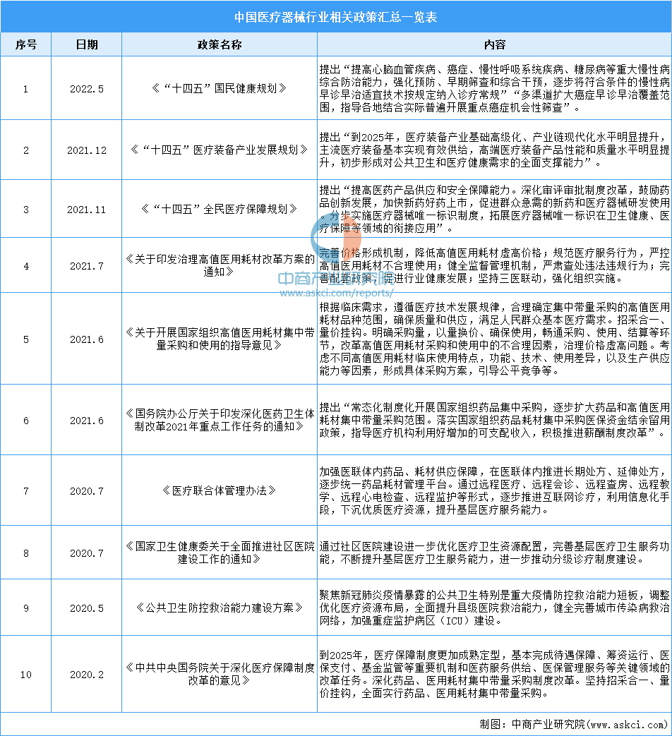 《中华人民共和国国民经济和社会发展第十四个五年规划和2035年远景目标纲要》提出重点部署医疗器械国产化在内的重点任务;《“健康中国2030”规划纲要》和《中国制造2025》都将医疗器械发展提升至国家发展战略地位。医疗器械行业作为我国人民生命健康和医疗卫生事业的重要组成部分,得到国家的高度重视。为促进我国医疗器械行业进一步的快速发展,近几年来国家不断出台利好政策,在政策层面给予行业大力扶持,鼓励国产医疗器械加快创新、做大做强。