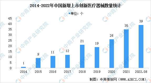 我国高度重视医疗器械的创新发展,并对具有发明专利、技术上具有国内首创、国际领先水平、并且具有显着临床应用价值的医疗器械设置了特别审批通道。目前,我国共有173个创新医疗器械获批上市。其中,2021年,国家药监局共批准35个创新医疗器械产品上市,比2020年增加35%;截止2022年8月,共批准39个创新医疗器械产品上市。