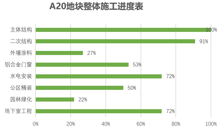 主体结构完成100%;二次结构完成91%(砌筑完成99%;抹灰完成99%;保温完成76%),铝合金门窗、栏杆完成53%;水电安装完成72%;地下室工程完成72%,公区装修完成50%,外墙涂料完成27%,园林完成22%。