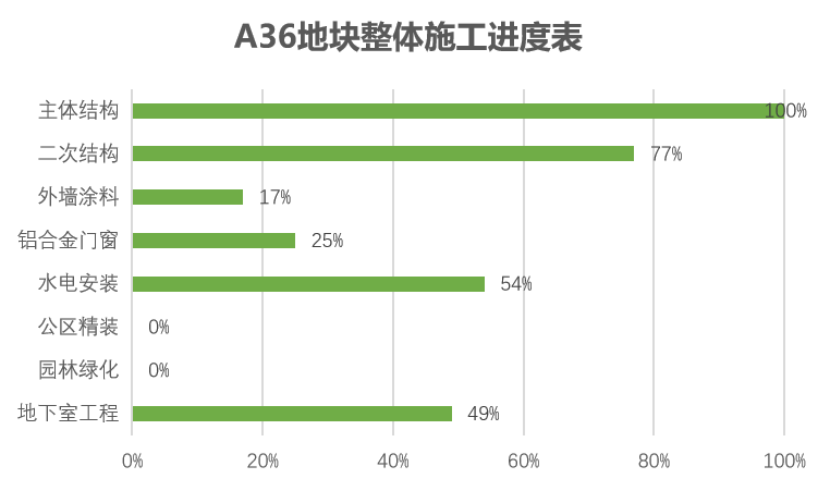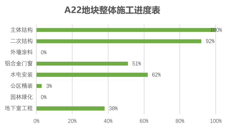 主体结构完成100%、二次结构完成92%、水电安装完成62%、地下室工程完成38%,栏杆完成12%、门窗完成51%、消防完成40%,精装完成3%,正式电梯1%。