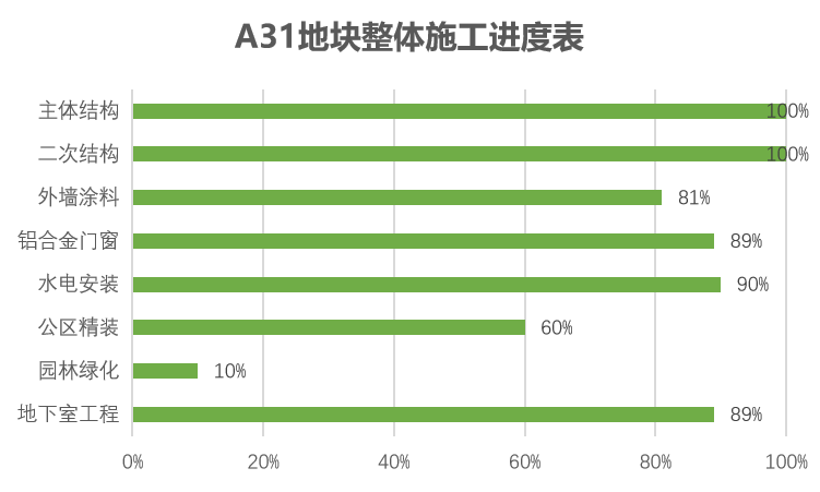 主体结构完成100%;二次结构完成100%;外墙涂料完成81%,铝合金门窗整体完成89%;水电安装完成90%;公区精装完成60%;园林绿化完成10%;地下室工程完成89%。