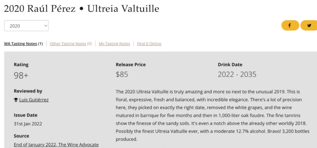 1、获得帕克团队98+分,可能是有史以来巨好的年份2020年阿特拉瓦图伊干红获得帕克团队98+分。这个分数对比几百块的价格,性价比真的很香。这也是找酒的乐子之一。以下是帕克团队酒评:2020 Ultreia Valtuille 确实令人惊叹,与不寻常的 2019 年相比更是如此。花香宜人,富有表现力,清新平衡,难以置信的优雅。这里有很多精确度,他们选对了正确的采摘日期,葡萄酒在橡木桶中陈酿了5个月,然后在 1000 升大橡木桶中陈酿。沙质土壤带来了细腻的单宁。它甚至比已经很好的 2018 年还要高一个档次。可能是有史以来巨好的 Ultreia Valtuille,酒精度为 12.7%。太棒了!生产了 3,200 瓶。佩雷酒庄(Raul Perez)成立于 2003 年,庄主兼酿酒师劳尔·佩雷出生在一个酿酒世家。佩雷是西班牙醉好的酿酒师之一。劳尔对葡萄酒酿造有其独有的“二分法”,他说:“我酿造的红葡萄酒中有白葡萄酒的灵魂,白葡萄酒中也同样有红葡萄酒的精华。”劳尔酿了很多不知名的葡萄品种和小众产区,产量都很少。他对老藤的掌控能力很出名,并且把老藤门西亚葡萄酒(Mencia)做到了天花板。一头长发卷曲蓬松,灰白色的大胡子,个子不高。如果不是知晓劳尔大叔的名号,真的很难把这个胡子拉碴的男人联想成世界上厉害的酿酒师。2014年,他被德国出版机构Der Feinschmecker评为“年度酿酒师”;2015年被法国酒评机构贝丹德梭评为“世界醉佳酿酒师”。台湾著名葡萄酒作家林裕森在其著作《西班牙葡萄酒》中曾说:“西班牙国宝级的鬼才酿酒师劳尔·佩雷将门西亚葡萄酒的风格定位成介于黑皮诺(Pinot Noir)和品丽珠(Cabernet Franc)之间:门西亚通常有着双重性格,有时有着黑皮诺般的黑樱桃果香以及丝绸般精巧的单宁口感;有时候又有着品丽珠的青草、花香、石墨以及矿石香气,中等的酒体又有着天鹅绒般的质地。”佩雷酒庄醉重要、最著名的红葡萄酒当属乌特里系列(Ultreia Series)。乌特里系列参考法国勃艮第进行等级划分,由低到高分别为村庄系列(village)、 葡萄园系列(a collection of vineyards)和单一园系列(single vineyard)。此款酒是乌特里系列中产量醉少、价格醉贵的单一园单一品种老藤旗舰级酒款。它被誉为“门西亚大师”(The Master of Mencia),是劳尔·佩雷的得意之作。5、110 年超老藤,单一园,年均产量仅 3200 瓶此酒出自比埃尔索(Bierzo)瓦图伊村(Valtuille)的单一园,葡萄种植于 1908 年,树龄高达 110 年的老藤,年均产量仅 3200 瓶,十分稀有。在单一园中,这些老藤分布在山上多个地块中,如同勃艮第一样,每个地块有其各自特征。在葡萄酒大师休•约翰逊(Hugh Johnson)和杰西斯•罗宾逊(Jancis Robinson)共同撰写的《世界葡萄酒地图》(The World Atlas of Wine)一书中,此酒被收录在西班牙西北部内陆地区内容中,总共只有 2 款酒收录在此,足见此酒地位。书中这样描述:“帕拉西奥(Palacios)家族向世界介绍了比埃尔索充满活力的优质红葡萄酒,可是在比埃尔索的劳尔,酿制了乌特里(Ultreia)系列,已经成为下面地图里 4 个葡萄酒产区的引领人物。”比埃尔索位于西班牙西北部,处于大西洋气候与大陆性气候交界地方。产区山势多变,富含铁质的砂质粘土的,能酿造出柔和多果味的可口精巧葡萄酒,非常适合门西亚葡萄种植。有别于西班牙大多数产区酿造颜色深、酒精度高、浓厚多单宁的葡萄酒,比埃尔索的葡萄酒不仅精致,也相当平易近人,展现西班牙未曾有过的优雅。8、门西亚:葡萄酒发烧友正在关注的小众精品葡萄品种这款酒采用门西亚酿造,门西亚广泛种植在西班牙的西北部。在西班牙,采用门西亚所酿造的单一品种红葡萄酒香气馥郁,果味十足。在比埃尔索产区内,一些产量较低且生长在片岩土壤中的老藤门西亚所酿造的葡萄酒风味浓郁且集中。葡萄品种:100% 门西亚