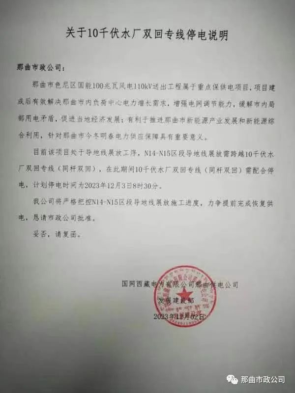 我公司于12月2日晚上收到电力公司通知:“那曲市色尼区国能100兆瓦风电110kV送出工程正在导地线展放工序,N14-N15区段导地线展放需跨越10千伏水厂双回专线(同杆双回),10千伏水厂双回专线(同杆双回)需停电。”导致2023年12月3日8时30分起,我公司供水和供暖业务因不可抗力停供,恢复时间以电力公司恢复供电时间为主。电力公司恢复供电后,我公司将逐步恢复供水供暖工作。请广大用户予以理解和支持。