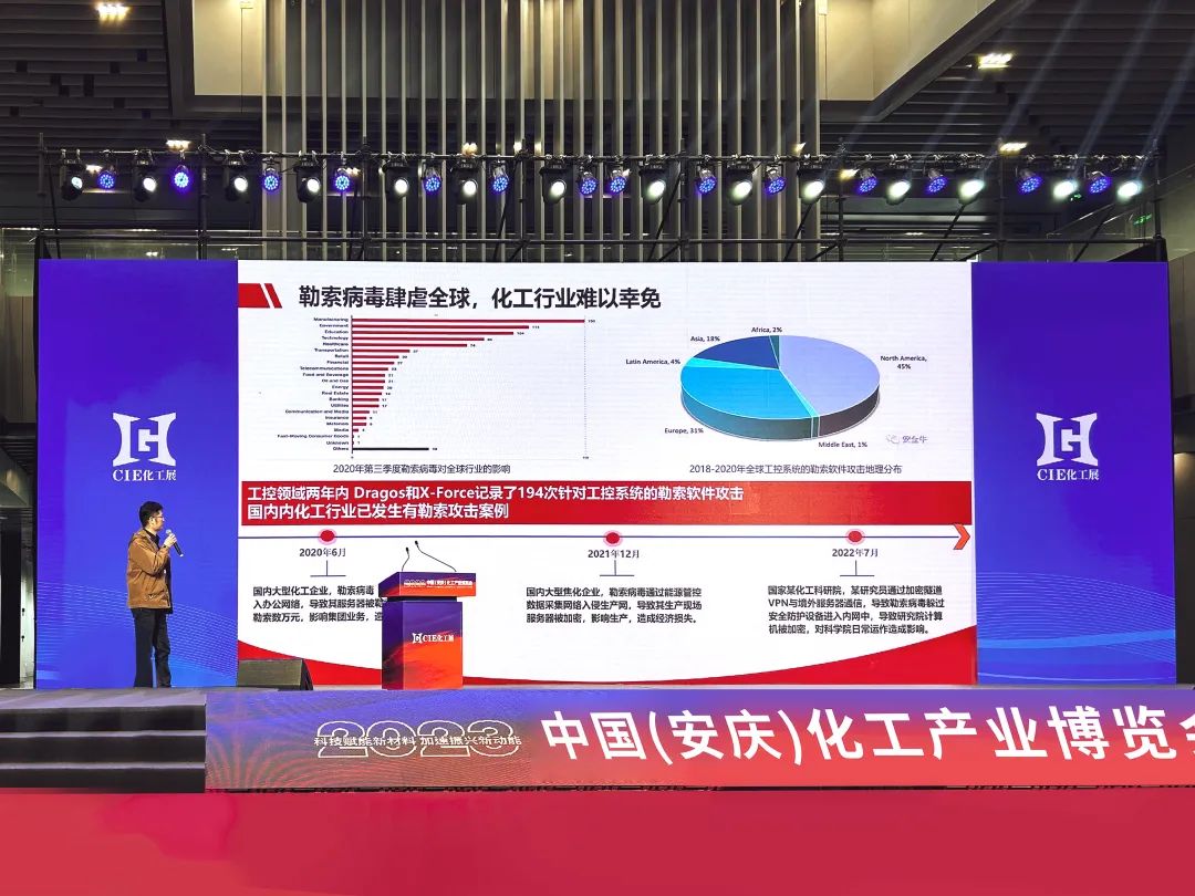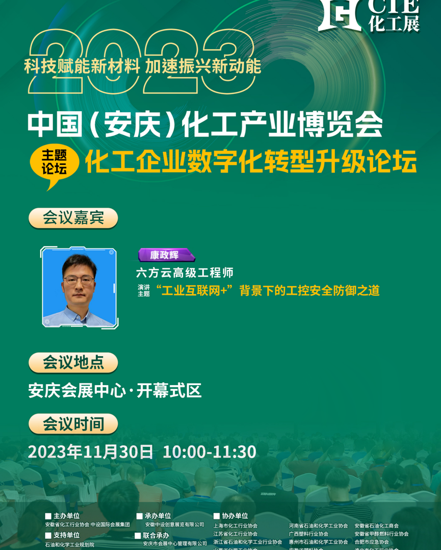 近日,由石油和化学工业规划院、安庆市经济和信息化局、安庆高新技术产业开发区支持,安徽省化工行业协会、中设国际会展集团主办的2023中国(安庆)化工产业博览会(简称“CIE化工展”) 在安庆会展中心举办。本次博览会围绕化工新材料、安全、环保、数智化、园区等内容,通过产业链上中下游的联动,打造产品展示、技术交流、贸易对接的行业平台。省内外参展企业300余家,是在安徽举办最大规模的化工行业全国性展览会。六方云作为工业互联网安全领军企业,应邀参展并做主题报告演讲