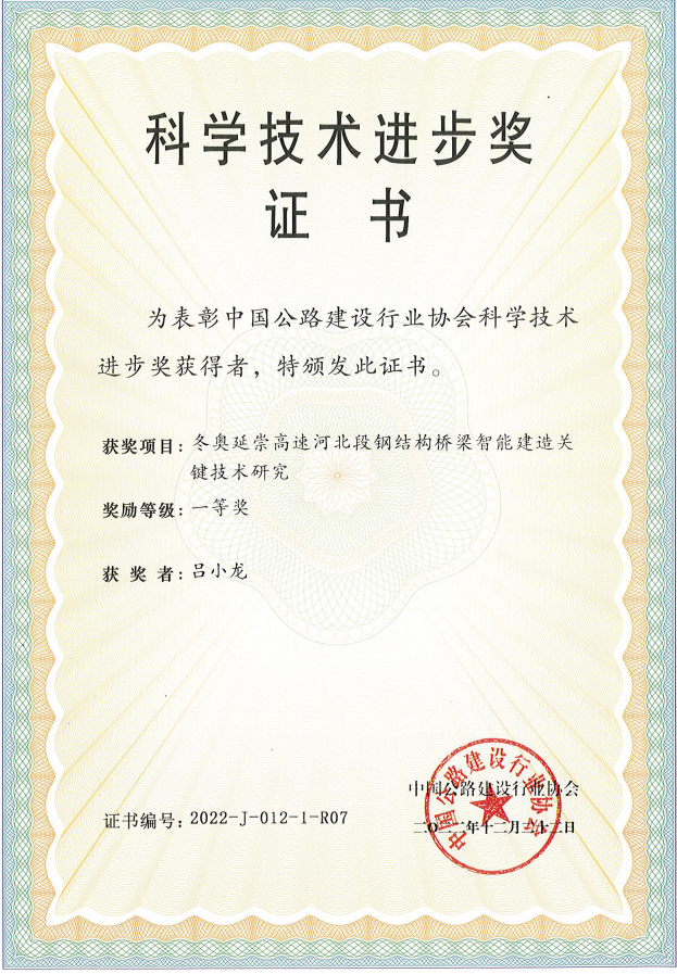 冬奥延崇高速河北段“钢结构桥梁智能建造关键技术研究”获得2022年中国公路建设行业协会科学技术奖一等奖;