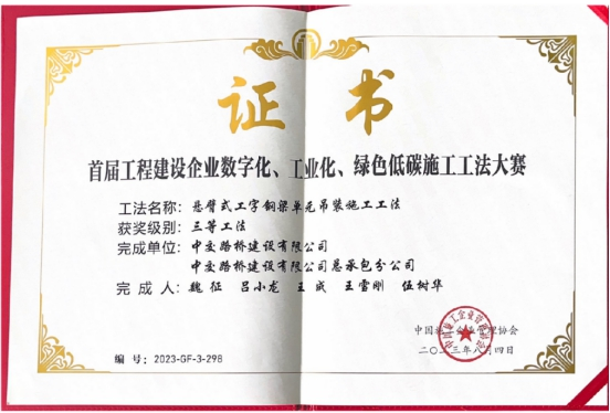 科研成果“悬臂式工字钢梁单元吊装施工工法”获得首届工程建设企业数字化、工业化、绿色低碳施工工法大赛三等工法。