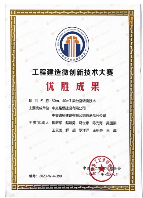 科研成果“30m、40m T梁台座转换技术”获得中施企协第三届工程微创新技术大赛优胜成果;