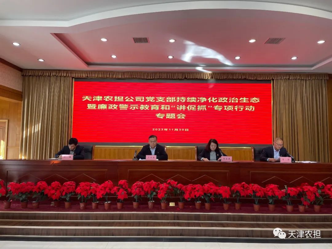 为深入学习贯彻习近平总书记关于全面从严治党的重要论述和重要指示批示精神,巩固学习贯彻习近平新时代中国特色社会主义思想主题教育成果,确保农担公司党支部全面从严治党各项工作取得扎实成效,政治生态持续向好,按照工作安排,11月30日,农担公司党支部召开了持续净化政治生态暨廉政警示教育和“讲促抓”专项行动专题会议。公司全体职工参加会议。 会议通报了近期违规吃喝、违规使用公车等违纪行为的典型案例,以及国有金融企业违纪违规典型案例,并针对通报的案例开展警示教育,坚持以案说纪、以案说法、以案说德、以案说责。针对农担公司目前存在的支部战斗堡垒作用和党员先锋模范作用发挥不够、纪律规矩意识、责任意识、底线红线意识不强等问题,要求全体党员干部职工要从通报的典型案例中吸取教训,强化自身作风纪律建设,严格执行中央八项规定实施细则精神。 会议强调,2024年是农担公司成立十周年,也是推动农担公司高质量发展的关键一年。全体党员干部职工要发扬再创业精神,坚决按照党中央、市委和市农业农村委党委各级部署要求,落实好全面从严治党各项工作,坚持党建立企、党建兴企、党建稳企。一是要把党的政治建设摆在首位,牢固树立政治意识、大局意识、核心意识、看齐意识。二是要始终重视思想建党、理论强党,使全公司始终保持统一的思想、坚定的意志、协调的行动、强大的战斗力。三是要不断强化制度治党,始终把纪律和规矩挺在前面,把权力关进制度的笼子,提高制度的执行效力。四是要持之以恒正风肃纪,推动全面从严治党向纵深发展,坚持不敢腐、不能腐、不想腐一体推进。五是要扎实推进清廉国企建设走深走实,构建“政治生态清朗、党风企风清正、从业行为清廉”的清廉国企。