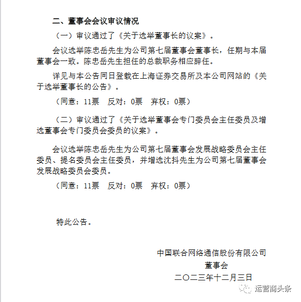 会议选举陈忠岳先生为公司第七届董事会董事长,任期与本届董事会一致。陈忠岳先生担任的总裁职务相应辞任。详见与本公告同日登载在上海证券交易所及本公司网站的《关于选举董事长的公告》。(同意:11票 反对:0票 弃权:0票)