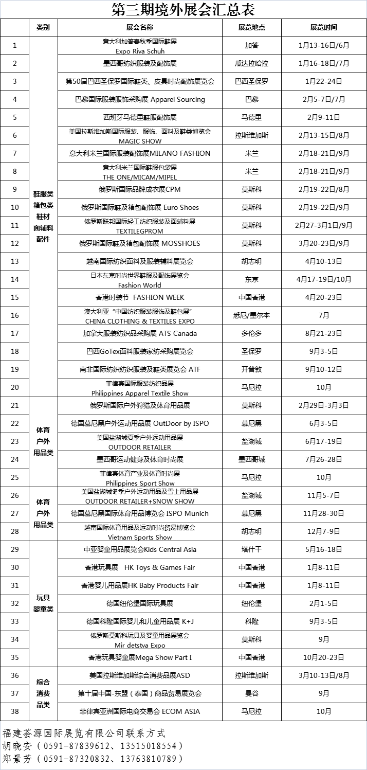 2024年境外展会信息(第三期),请查收。请各有关企业视自身发展需要积极赴境外参展。如有意参展请及时联系组展单位(电话附后)。已确定参展的企业,请同步向县工信商务局报备(联系电话:87382436),并将参加展会名称、时间等信息发送至邮箱shangwuju2015@163.com,以便落实相关政策兑现工作。