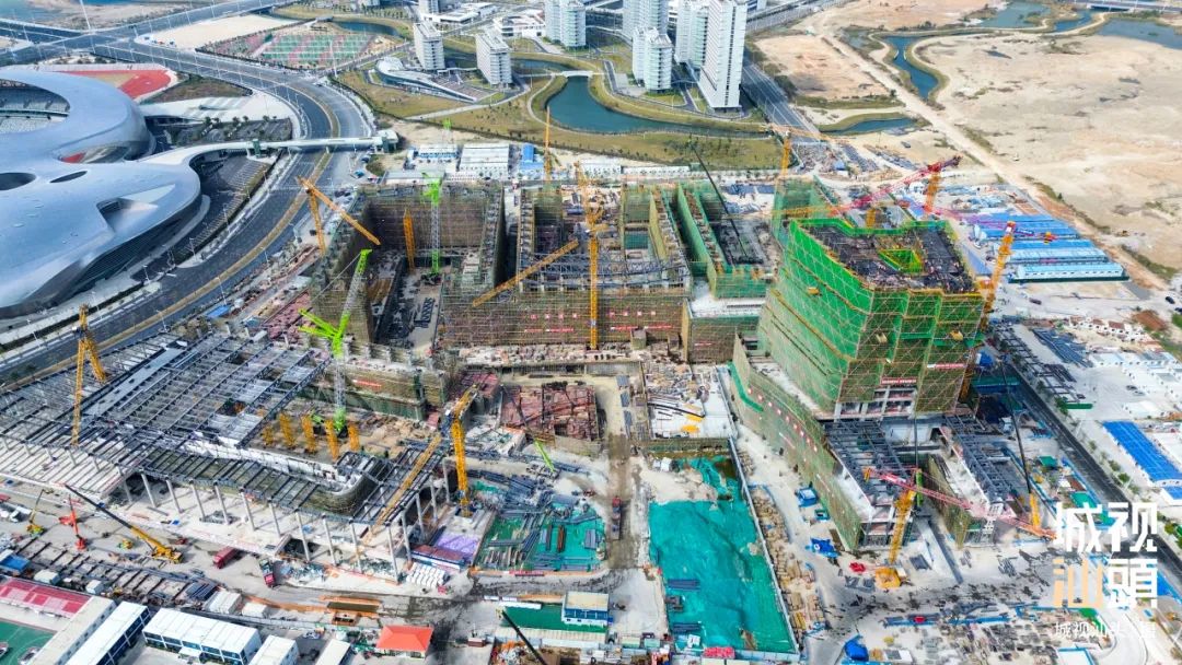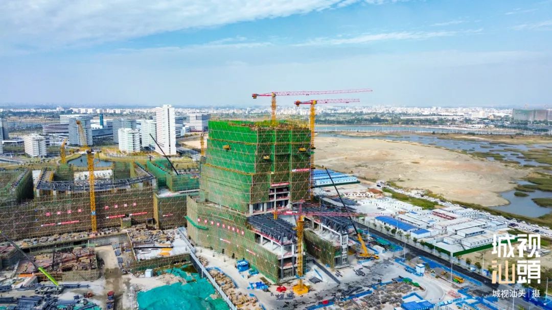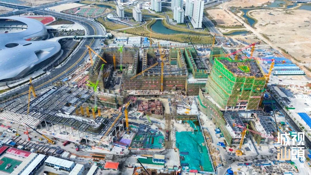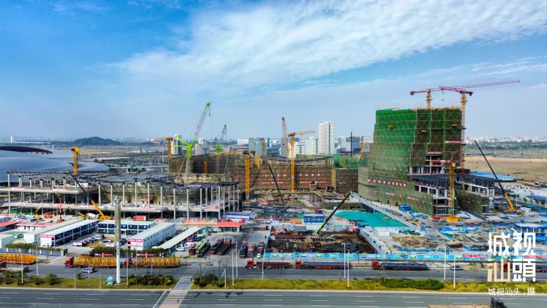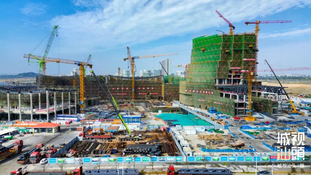 位于东海岸新城塔岗围片区的汕头国际会展中心及配套酒店项目进展顺利,会展中心正进行钢结构吊装,酒店主体结构建设已完成过半,初具雏形。