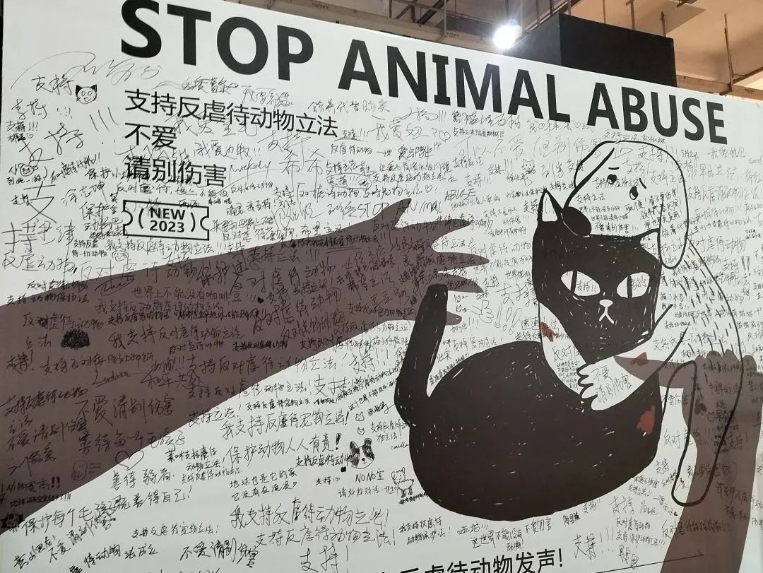宠博会展馆一楼醒目的反虐待动物签名墙给小爪留下了深刻的印象。