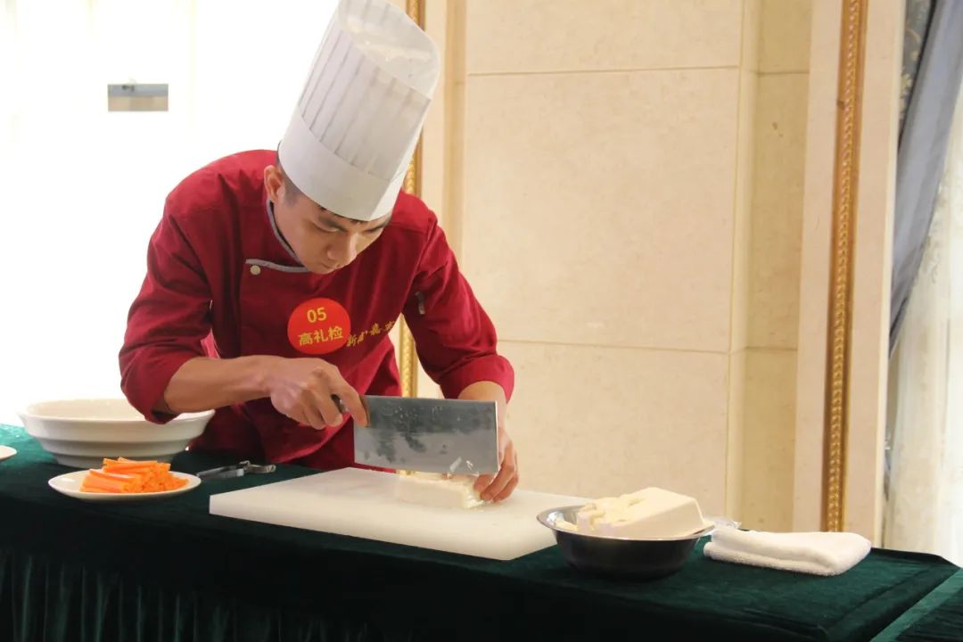 参赛选手们认真备战,冷静从容,精益求精。在个人参赛环节,比起往年,在餐饮铺台的基础上,今年新增刀工展示这一环节,虽然切胡萝卜丝、豆腐丝是基本功,但是很考验刀工技术,比赛现场紧张而激烈。