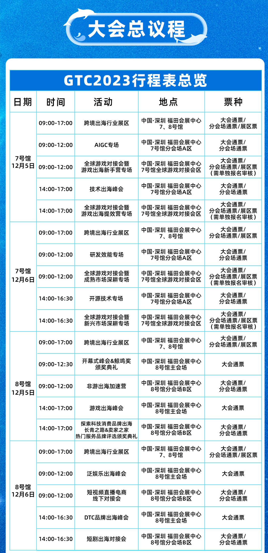 嘉宾分享议题将涵盖社交娱乐、电商、游戏、泛娱乐、技术等多个跨境出海热门领域,话题涉及出海战略部署、市场机遇、行业解析、市场开拓等内容。在这里,你将抢先一步获得最新的跨境商机,跟着大佬的脚步一起把握最新出海风口红利!跨境出海行业展区作为全球流量大会的重点项目之一,一直深受广大跨境出海企业品牌所关注。对于参展企业来说,这是一次绝佳的品牌曝光机会,也会是一座绝好的经验交流桥梁。本届大会中,15000㎡活动场地将迎来超200家跨境出海优质品牌参展,共同为参会观众带来一次出海品牌的顶级展览盛宴。在规模扩大、参展商增加、参会嘉宾增加的前提下,本届大会参会观众预计将再次提升!上万跨境出海从业者参会,人群覆盖跨境出海生态中的各行各业。强大人脉资源汇聚,等你来挖掘!在活动内容及形式方面,GTC2023 将举办 4 场主峰会+4 场技术沙龙+6 场对接会+2 场行业沙龙+1 场高端闭门晚宴+1 场颁奖典礼,另外还有一系列线下交流活动同步开展。其中,在大会前一晚举办的VIP欢迎晚宴,主打高端、私密,通过更隐私的交流空间帮助大家搭建人脉资源对接机会;主会场上4场主题峰会将分别围绕游戏出海、泛娱乐出海、跨境电商以及跨境出海行业全貌展开分享讨论,更有鲸鸣奖加持,共同见证 2022 年度跨境出海领域领导者与 TOP 级企业品牌的实力与风采;4场技术沙龙将以“开源”“AIGC”“研发效能”及“技术出海”四大关键词展开讨论;而在2天6场对接会中,由4场全球游戏对接会组成的史上规模最大游戏对接会分外亮眼,另外还有短视频直播出海对接会以及短剧出海对接会相继亮相,助力广大跨境出海从业者完成资源的高效对接;2场行业沙龙则分别围绕非游应用出海及科技消费品牌出海开展,重点聚焦业内热门话题,帮助从业者答疑解惑,突破增长瓶颈。
