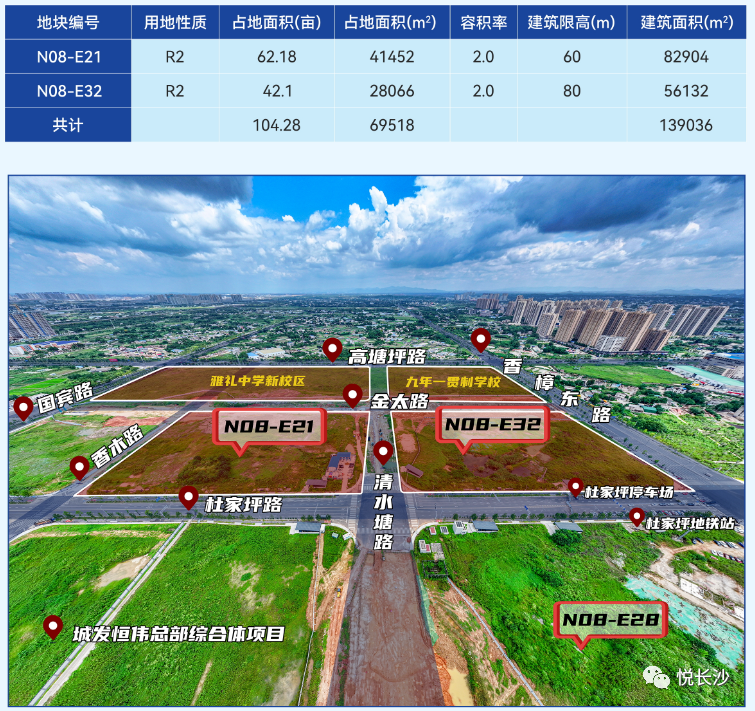 12月4日,会展新城官微发布N08-E21、N08-E32优质地块推介。地块位于中国(湖南)自由贸易试验区长沙片区会展区块,毗邻城市中央绿轴,隶属会议会展中心区,东至金太路,西至杜家坪路,北至香木路,南至香樟东路。地块为纯住宅用地,占地约104.28亩,总建面约13.9万平方米。地块离雅礼中学新校区、雅礼九年一贯制学校仅一路之隔;雅礼中学新校区和雅礼中学(本部)实行“一个机构、一套班子、两个校区”的办学模式,计划2024年开建,2025年秋季开学;同时,在新校区毗邻用地,同步统筹建设一所九年一贯制学校,计划2026年开学,建成后有望委托雅礼中学总部托管。地铁4号线杜家坪站在地块外设有双出入口,距长沙高铁南站仅2站;地块距地铁2号线光达站约800米。地块1公里范围内规划有4大公园,分别为清水塘公园、光达公园、中轴公园、金凤公园,距10公里浏阳河风光带约1.5公里,距8000亩画田垸湿地约2公里。