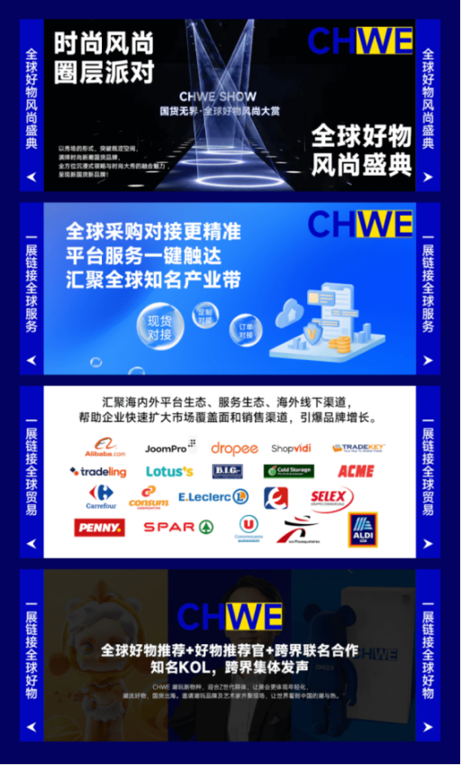 CHWE现场将以汇聚全球爆款产品、性价比产品、新奇特产品、潮玩好物、现货薅羊毛!集齐母婴玩具、礼品配饰、鞋服箱包、运动户外、3C电子、美妆个护、家居园艺、家具家装、数码家电等热门商品,满足各类采购商需求。