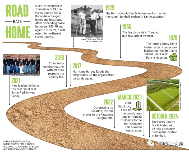 哈里斯县牛仔竞技大会主席弗雷德-斯托克顿(Fred Stockton)旗下的斯托克顿基金会公司(Stockton Foundation Inc.)已在汤姆博尔附近的大公园路以北获得 165 英亩土地,为牛仔竞技表演创建一个新的永久会址。