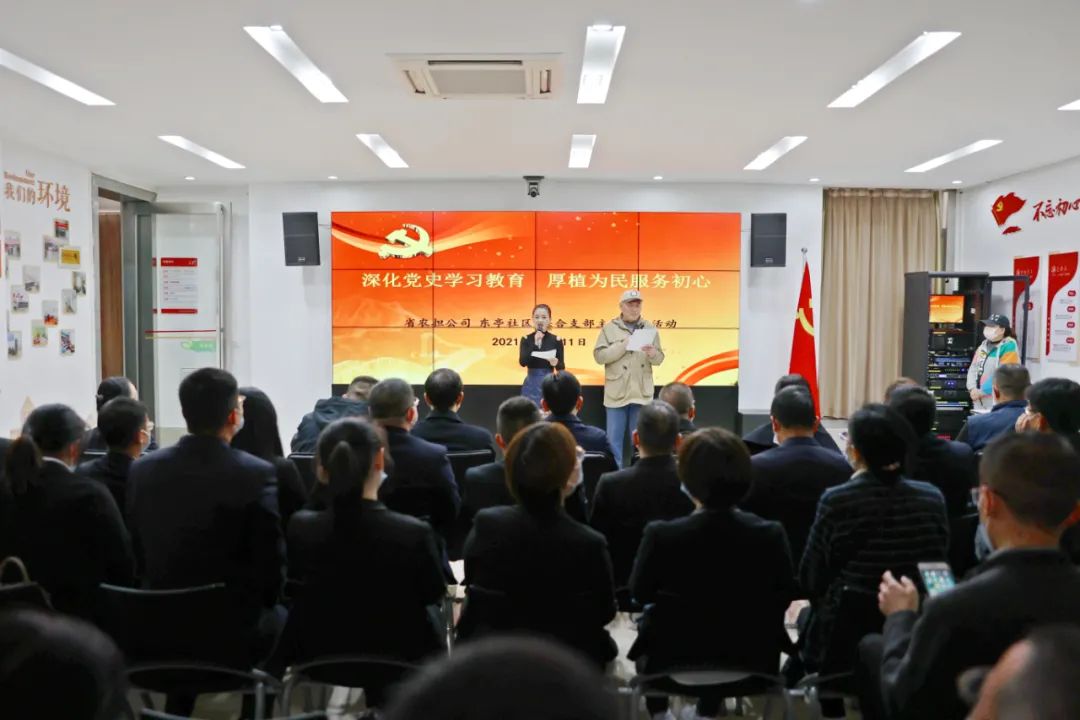 为进一步提升公司党委与东亭社区党委的党建共建水平,增添组织生活活力,11月11日下午,省农担公司与东亭社区以“深化党史学习教育 厚植为民服务初心”为题,组织开展了一次别开生面的联合支部主题党日活动,来自省农担公司和东亭社区以及下沉社区的50名在职党员,共聚一堂,以生动鲜活的形式,共同学习贯彻党的十九届六中全会精神,省农担公司党委书记、董事长吴先锋参加活动并讲授专题党课,党委委员、纪委书记向佳荣,党委委员、总会计师李颖参加活动,活动由东亭社区党委书记王学丽主持。