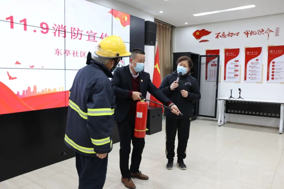 全国社区消防宣传大使、全国119消防奖先进个人、东亭社区党委书记王学丽还在活动中为参会人员组织开展了一次消防知识宣传和现场演练,为大家讲解面对火灾发生时的正确应对方式以及灭火器的正确使用方式,并邀请在场的党员体验操作,熟悉灭火器的使用,进一步帮助党员掌握消防知识和自救援救技能,提高大家在秋冬季等气候干燥情况下防范应对消防安全事件的能力,确保今后开展志愿服务更具有针对性,在保障人民群众生命财产安全等工作中能做出更多贡献。