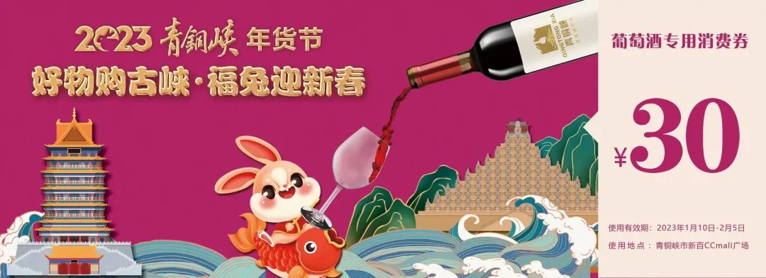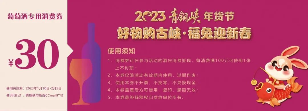 凡消费葡萄酒满100元即可使用一张30元的抵现消费券