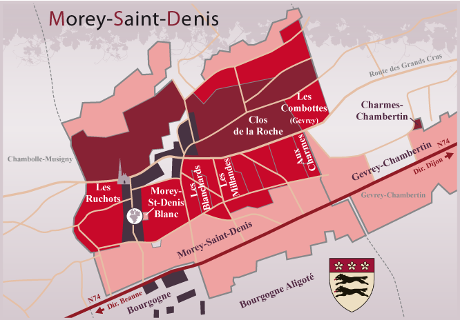 莫雷圣丹尼村是一个由背斜谷孕育而生的产区,山谷的冷气流对坡下的葡萄园起到降温的作用,保证了产区不会过分炎热。莫雷圣丹尼村的村徽是两匹并肩奔跑在荒漠的狼和三朵镶金的梅花,而莫雷圣丹尼的特点,也有人形容其充满“野性”:标志性的香料味和肉味。