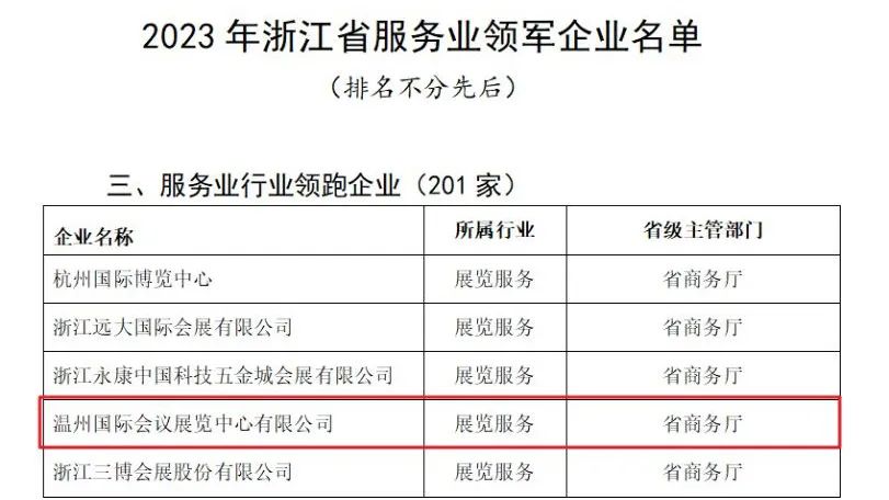 近日,浙江省发展和改革委员会公布了《2023年浙江省服务业领军企业名单》,温州国际会议展览中心有限公司获评展览服务业“2023年浙江省服务业行业领跑企业”,全省共5家展览服务单位上榜,温州唯一一家入选。