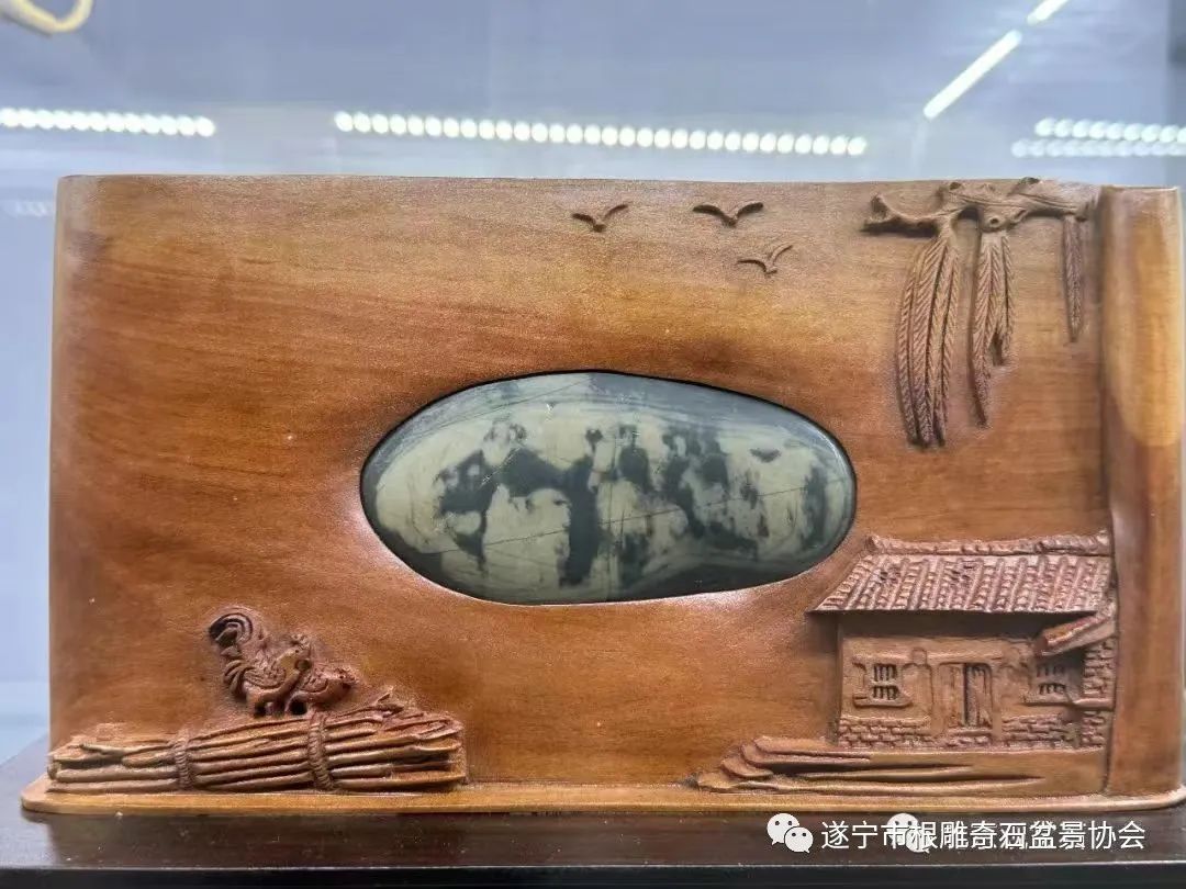 遂宁市根雕奇石盆景协会精选出8方皮、色、质、姿、形、神、韵兼备的美石送展,其中包括由五方小手把涪江石组合而成的、文化底蕴蓬勃的一组文字石:学而时习之。