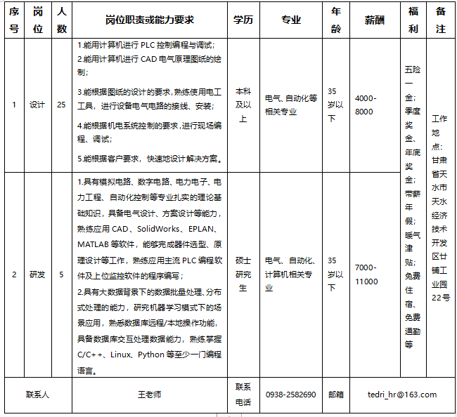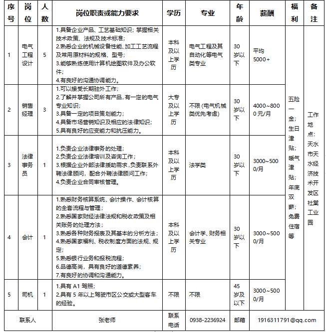 甘肃电气装备集团有限公司(以下简称“甘肃电气集团”)是省委省政府整合甘肃电工电气和电子信息资源优势,做强做优做大甘肃电子电气产业集群而组建的大型企业集团。业务涵盖输配电、工业电器、电气传动自动化、电机、人工智能、军民融合、文化装备、合金材料等领域。根据工作需要,甘肃电气集团下属企业——天水长城开关厂集团有限公司、天水电气传动研究所集团有限公司、兰州兰电电机有限公司、兰州理工合金粉末有限责任公司等4户企业面向社会公开招聘45名工作人员。