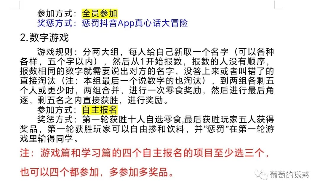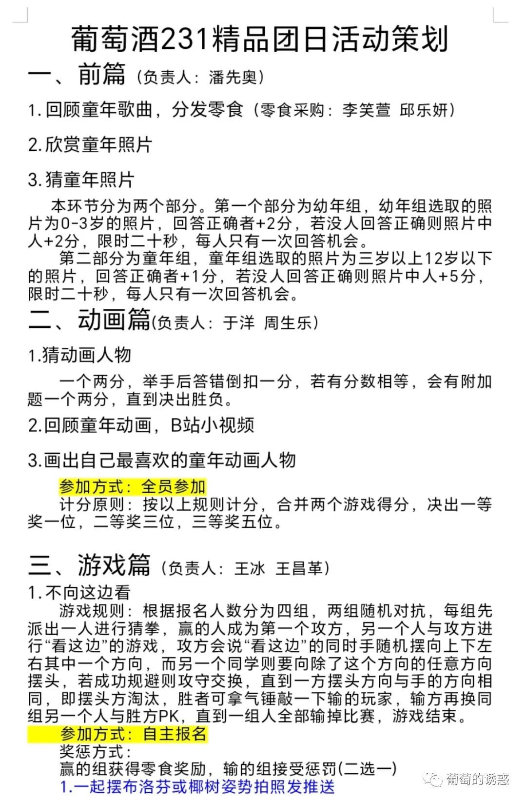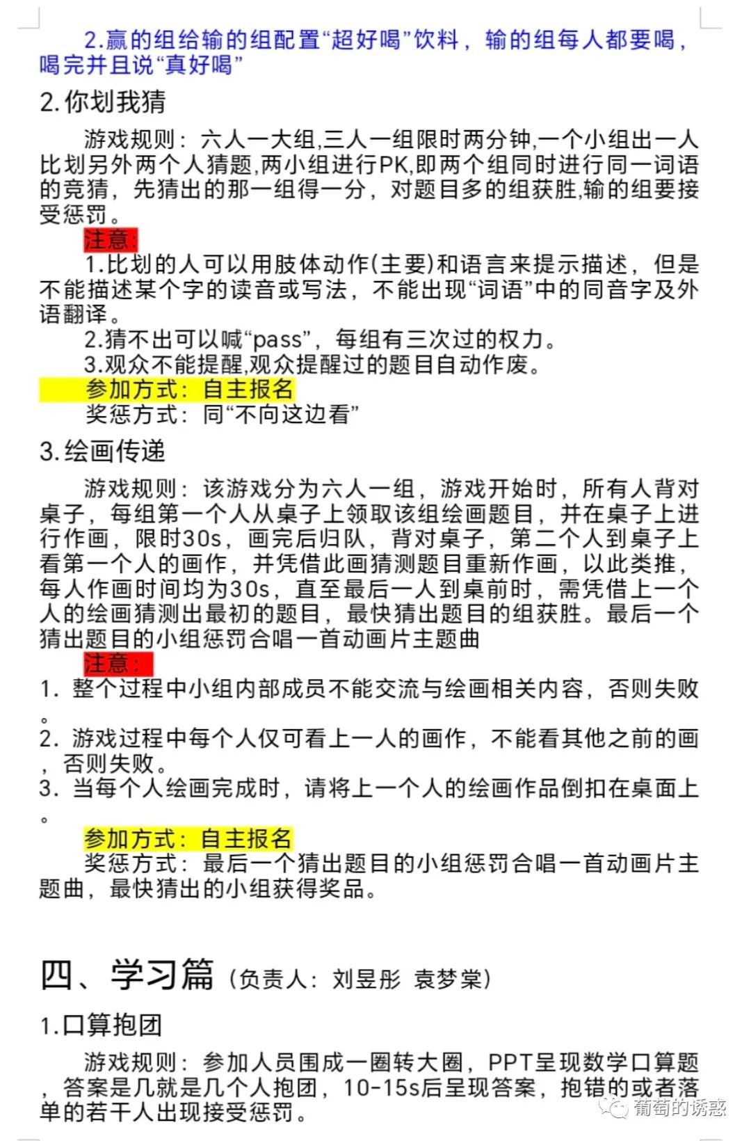 活动主要分前篇,动画篇,游戏篇,学习篇,每篇都有专门的负责人,让每位同学都参与进来,赢了就有零食和奖励,输了也有一些简单的惩罚,我相信,每个人都不会忘记这段美好的时光!