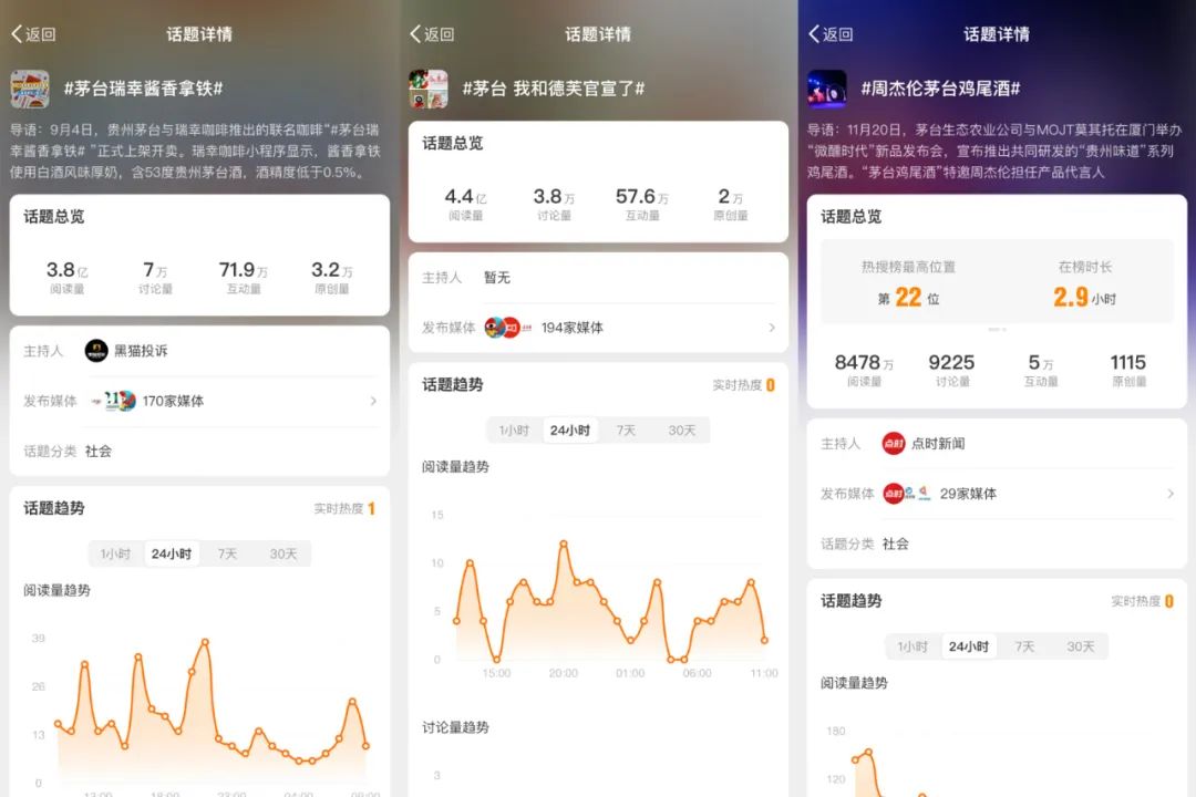 今年,是白酒顶流茅台疯狂联名的一年,从冰淇淋、咖啡、巧克力再到鸡尾酒,原本是中年人“奢侈消费”的茅台自降身价,让很多年轻人喝到了“人生第一口茅台”。要么不联名,一联名就“大搞特搞”。光是9月份,茅台一边牵手瑞幸推出酱香拿铁,火速冲上热搜累计3.8亿阅读量;另一边,茅台联名德芙上架茅小凌酒心巧克力,没有复刻酱香拿铁的销售神话,但相关话题也有4.4亿阅读量。