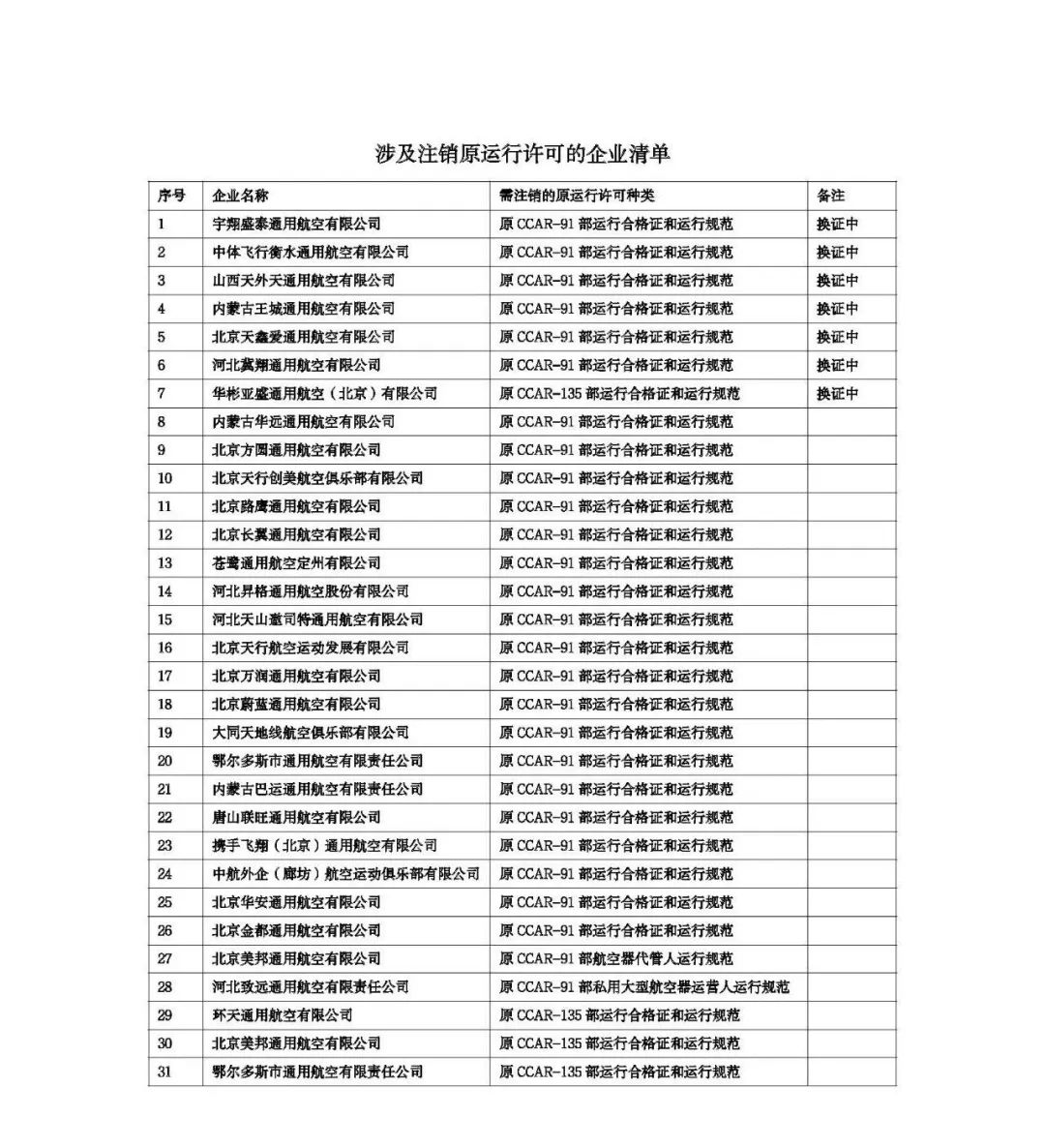 【写在开头】最近微信推荐机制调整了,可能有些朋友会收不到我们的推送,大家伙儿别忘了给(E通航)加上星标,以免错过更多精彩!涉及通航运行的 CCAR-91 部《一般运行和飞行规则》、CCAR-135 部《小型商业运输和空中游览运营人运行合格审定规则》、CCAR-136 部《特殊商业和私用大型航空器运营人运行合格审定规则》和 CCAR-141 部《民用航空器驾驶员学校合格审定规则》已经于 2022 年7 月1 日正式颁布并生效。按照相关咨询通告和工作文件的要求,原持有CCAR-91部和CCAR-135 部运行合格证和运行规范的通航公司应于2023年12 月 31 日前按照新颁布规章的运行种类分类和符合性要求完成新版运行合格证和运行规范的换发工作。原持有CCAR-141 部运行合格证和训练规范的通航公司应结合最近一次合格证更新完成新版运行合格证和训练规范的换发工作。 截止日前,我局已基本完成了计划内大部分的换证工作。经研究决定,现对目前正在进行换证审定工作但尚未完成以及未提交换证申请的持有旧版运行许可的两类通航公司清单予以公示。本次公示发布后,请相关通航公司及时校对清单信息内容的一致性,对信息存在异议的通航公司应及时向我局提交反馈,上报具体诉求及相关情况的说明。仍在 换证中的通航公司应积极配合审定工作组尽快完成全部换证工作。 此次公示期截止至 2023 年12 月31 日,公示期内我局将持续跟踪各通航公司的换证工作进度并对反馈上报的相关情况进行核实,进行必要的信息调整。公示期满后,相关通航公司获颁发的旧版运行合格证和运行(训练)规范将于2024 年 1 月 1 日正式失效。我局将对旧版运行合格证和运行(训练)规范进行集中注销处理并在FSOP 系统审定监察平台对相关运行许可实施终止运行操作。仍持有旧版纸质运行合格证的通航公司,需在公示期满后尽快上交我局。邮寄地址:北京市朝阳区首都机场路10 号民航华北地区管理局