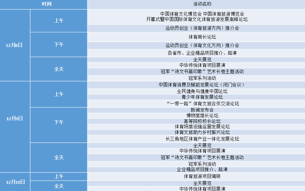 同期开展冠军系列活动、 运动员创业推介会、 国家体育旅游示范基地认定活动、中国体育旅游精品项目推介、中华体育文化优秀项目推介、中华传统体育项目展演等配套活动。
