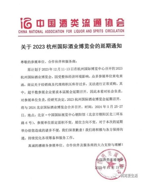 中国酒类流通协会近日宣布,原定于2023年举办的杭州国际酒业博览会将被延期,并与2024年的北京国际酒业博览会合并召开。这一消息引起了业界的广泛关注和讨论。那么,为什么要延期举办酒业博览会呢?