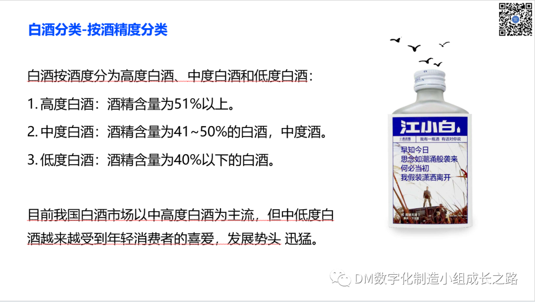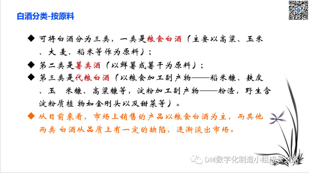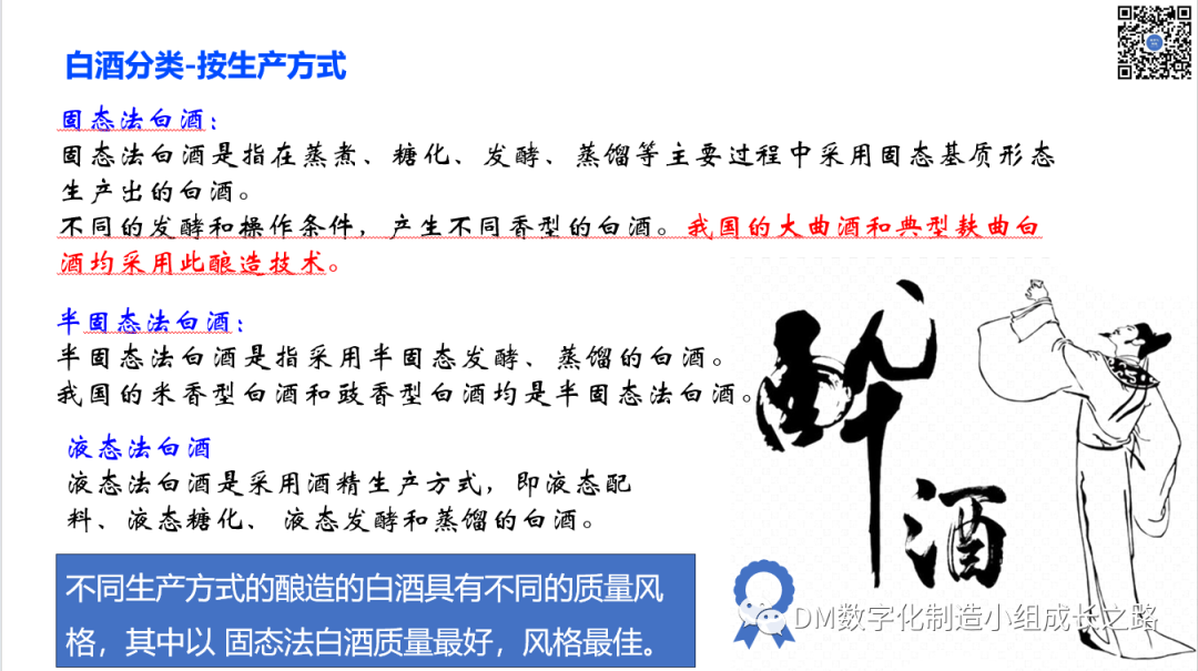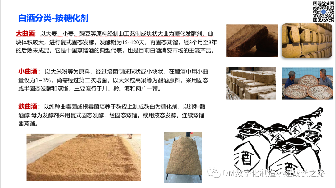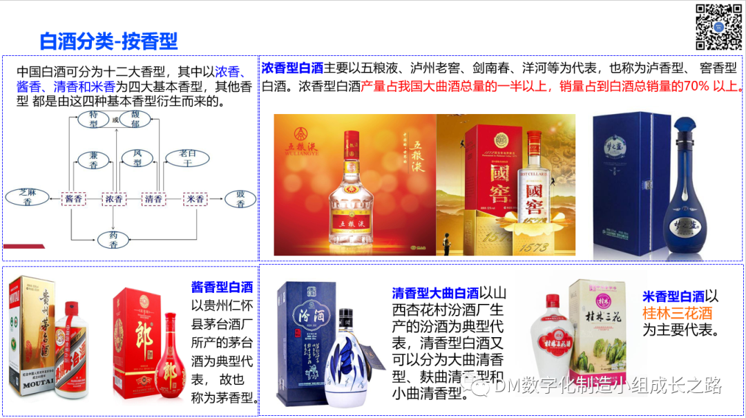 举个例子,第一,我们要做一个小加工产品数字化,那我们要知道这个产品它有哪些结构,有哪些零件,它的生产过程是什么样的,它的完整的工艺流程是什么?涉及到哪一些输入,哪一些输出?一定是要覆盖全流程全要素,并进行尽可能的大量的数据采集。下面,进入今天主题部分,因为之前给相关朋友做了分享,准备了材料,所以今天就直接截图了。通过对中国白酒的定义的学习,也让我正式接触了白酒这个行业。这个行业是高度成熟与发展的一个行业,头部企业的市占率不断地提升,CR5也是逐年的拉高,大酒企的利润率简直高的离谱。品牌的故事也越讲越新,越讲越多。白酒的出海随着中国人的活动圈子逐渐外延,相信不久的将来,白酒也会风靡全世界。而在数字化这件事情上面,白酒也取得了意想不到的进展。我去过了好几家酒厂,也看到了不少相关材料,行业内的大酒厂多多少少都已经在做数字化转型了。他们做的内容有全自动化的、现代化的少人的酿酒工厂,将原粮制曲拌粮上甑发酵以及交酒陈酿勾调进行全流程的自动化,相比传统的手工酿造效率大大提升。前段时间我去过的一家大牌酒厂有一个例子,以前他们的手工老窖池一天13个人组成一个班组,他们可以生产完一窖池,窖容是2000公斤。现在在他们现代化的自动化车间,他们只需要10个人组成一个班组,但一天可以生产至少5个窖池,而且窖容是4000公斤以上。简单的看一下这个差别就在10倍以上,也就是说现代化的酿酒厂可以将人员的效率提升90%,也就是可以缩减90%的员工。而除了自动化之外,对于酿酒工艺全流程的数据采集,温度、湿度、二氧化碳、氧气、淀粉含量等理化指标的检测也纷纷进行了数字化?因为这些手段极大的丰富了对于过程的实时管控、监控,对于过程品质的把握。让传统的白酒行业如虎添翼,有底气在做品牌营销的时候说上那么两句,这是我们的xx年份老酒、我们可以做到全流程的追溯等等。