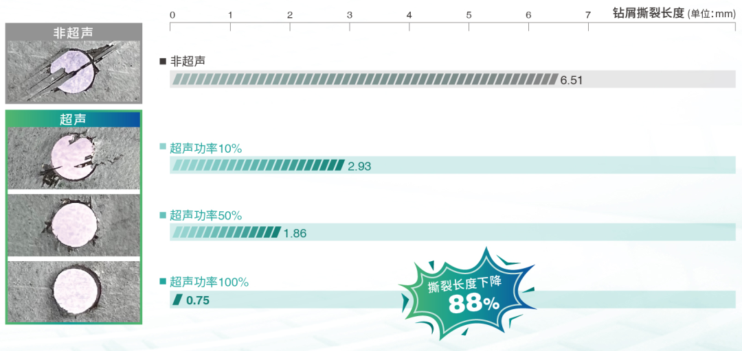 √ 随着超声功率增大,分层撕裂现象显著改善,圆孔切口完整,撕裂长度降至0.75mm,下降88%
