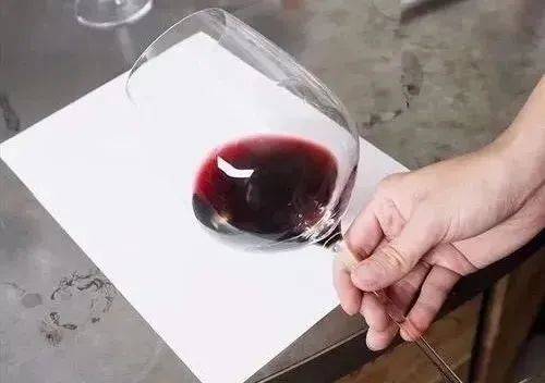 观察葡萄酒的颜色需要在自然光线下的白色背景上进行,可以选择白色的桌面,或在酒杯下放置一张白纸,然后将酒杯向自己的身体前方倾斜45°,从上方进行观察。